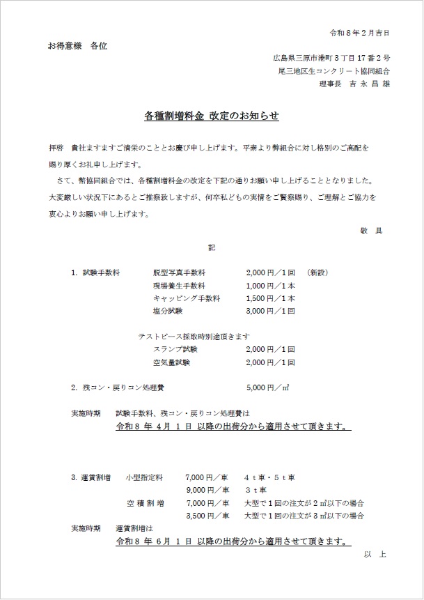 | 実施時期 | 試験手数料、残コン・戻りコン処理費は 令和8年4月1日 以降の出荷分から適用させて頂きます。 |